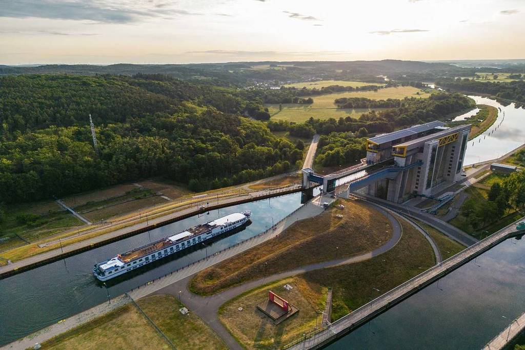 Its most important technical data include a height of around 60 meters, approximately 14,000 tons of steel used in its construction, and an 85-meter-long and 12-meter-wide trough with a water depth of around 2.5 meters. When filled with water, the trough weighs around 4,300 tons. It is suspended from 256 steel cables and balanced by 192 concrete counterweights – a system that ensures that the enormous elevator requires comparatively little energy.
