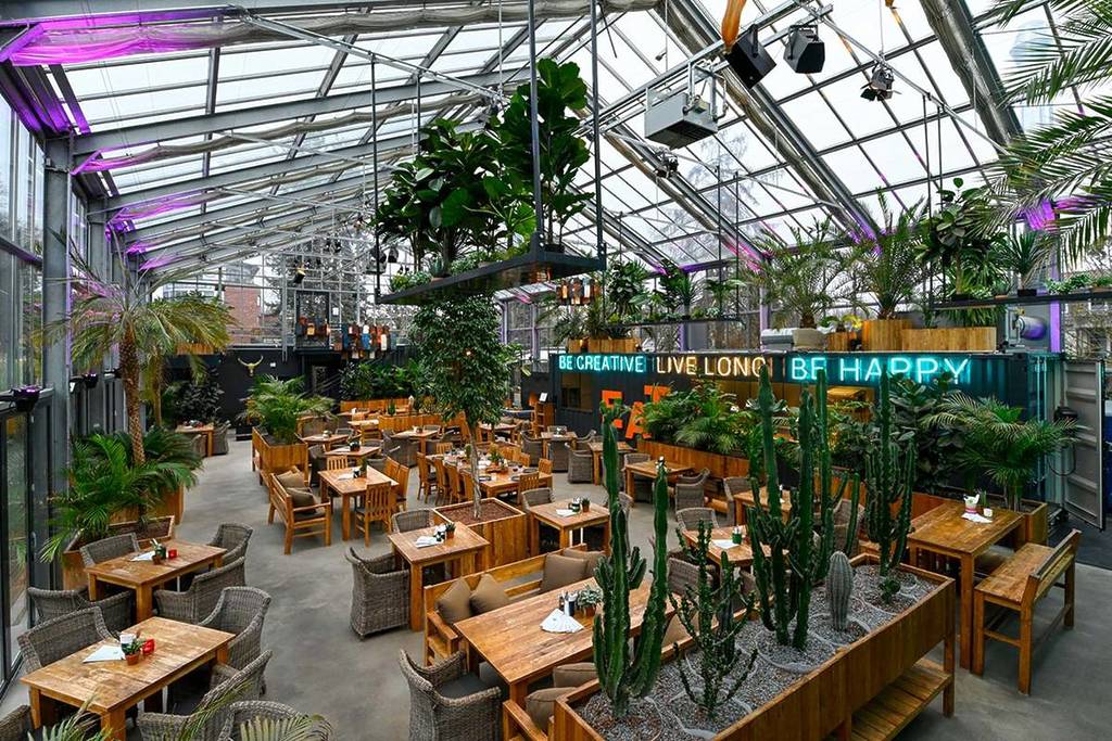 L’ambiance moderne et détendue du bar et du salon ajoute à cette sensation de vacances, accompagnée le week-end par des soirées DJ. Les tables offrent des places assises spacieuses et ouvertes, parfaites pour les groupes comme pour les couples. Comme son nom l’indique, une véritable « ambiance de serre » vous attend ici : une oasis urbaine et exotique au milieu du quotidien.
