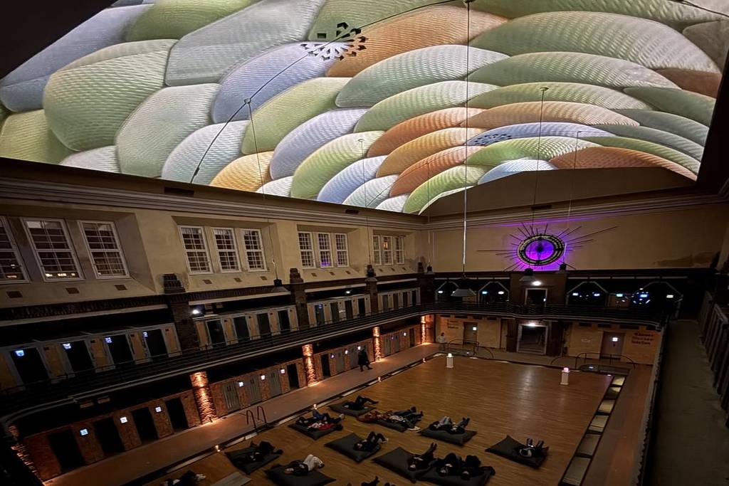 Alors que l’installation AMBILIGHT (nouveauté de la deuxième édition) transforme l’ancienne piscine pour hommes en un spectacle de couleurs spectaculaire avec plus de 63 000 lumières LED, la nouvelle attraction BEYOND donne une dimension particulière à l’ ancienne piscine pour femmes : des œuvres d’art numériques animées remplissent le plafond pendant que vous êtes allongés sur des tapis et profitez d’un voyage audiovisuel immersif. Sur plus de 200 m², des projections inspirées de l’espace se déroulent, accompagnées d’une musique de film atmosphérique qui vous plonge complètement dans l’art. Ne faites plus qu’un avec l’art et ayez l’impression de faire partie d’un film ou de rêver les yeux ouverts.